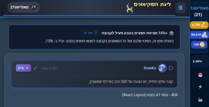 שם במשחק: מאזליסט21 קישור לפרופיל(לחיץ) זמן הבעיה: אני חושב שהתחילו לשנות את המשחק, שיהפוך לחלק יותר. רוב הקישורים נמחקו/צריכים חידוש אז זה כנראה קשור. קישור לעמוד עם הבעיה: https://www.pokeisrael.net/legacy/statistics תיאור הבעיה: היכל התהילה נראה מאוד מוזר, 90% מהקישורים שם לא עובדים – זה כותב "404 - עמוד לא נמצא (React Layout)" + העמוד לא עובד עם הדארק מוד + זה פותח עמוד בתוך עמוד שנכנסים דרך אחד הקישורים שלא עובדים. תמונה להמחשה: שגיאה במסך: (אם יש)