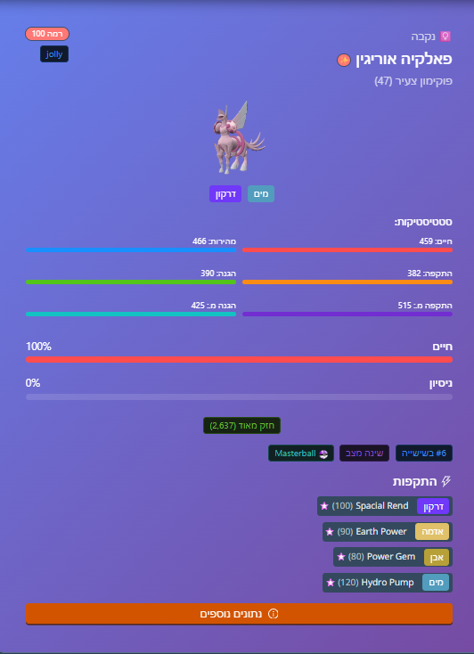 ⚔️Palkia Origin⚔️ פאלקיה אוריגין מסיימת מקום שני בליגה! עברה הקפצה מצב התחלתי: MIld מצב סופי: Jolly להצעות זמין בליגה(Hypnotic) או בדיסקורד (Adir)🙂 נמכר!!